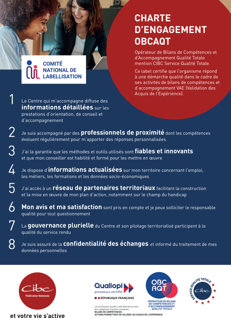 Membre du réseau national, le CIBC Sud Aquitaine détient le label OBCAQT – Opérateur de Bilans de Compétences et d’Accompagnement Qualité Totale – et la mention « CIBC Service Qualité Totale » depuis 2017  et il est audité régulièrement à ce titre.